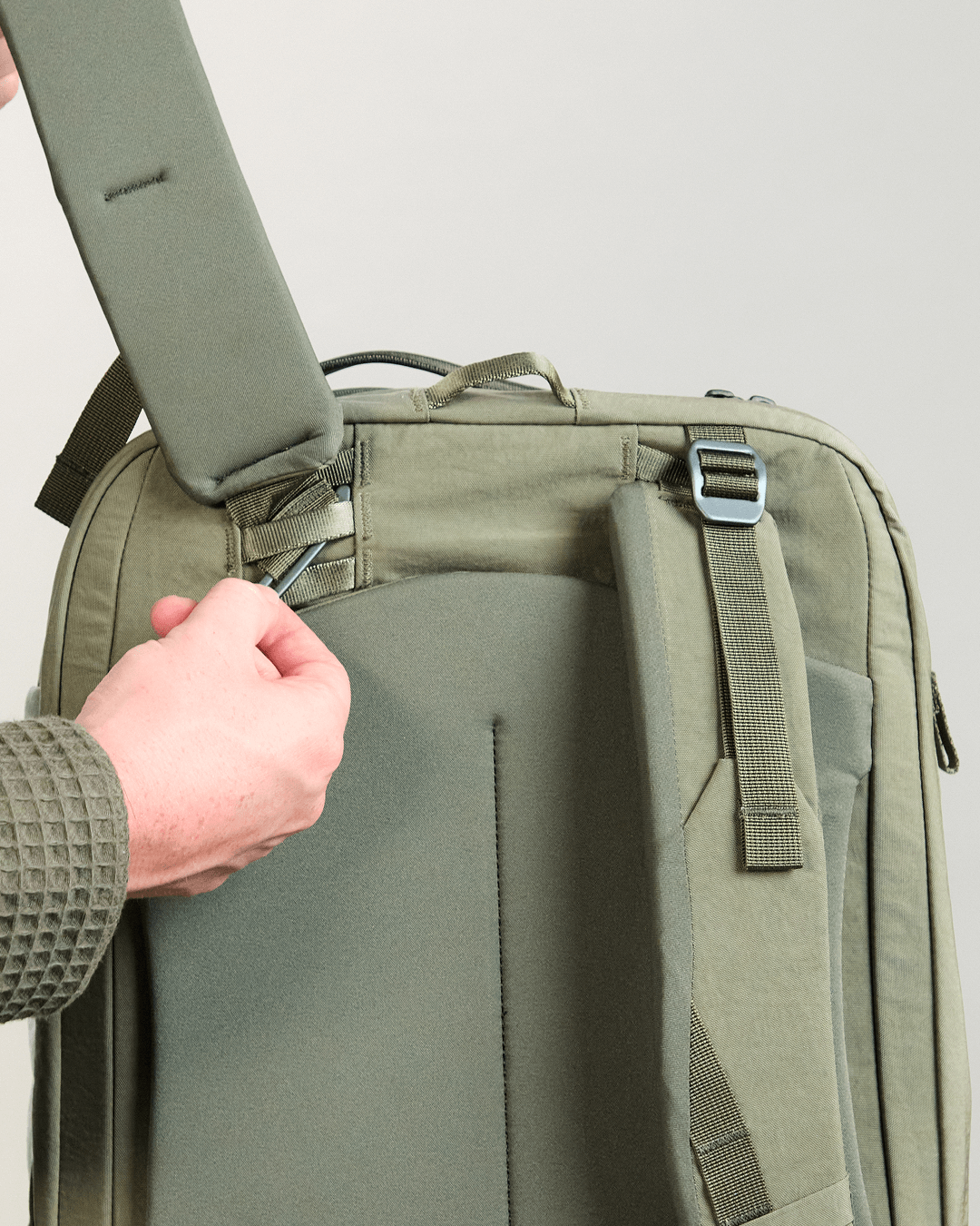 Give your back a break. Use the luggage pass-through to slide the bag onto the handle of a rolling suitcase.