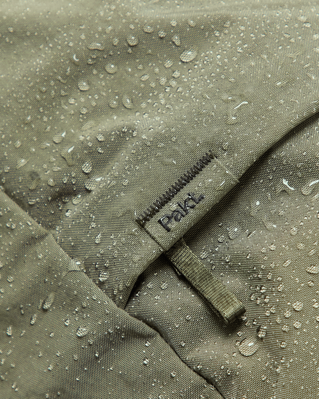 The Pakt One Travel Backpack is not completely waterproof, but the materials have been treated with a PFAS-free DWR (durable water-resistant) coating.